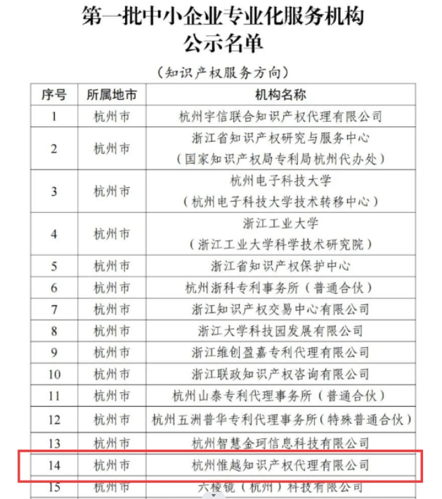 喜報?。£P于杭州惟越知識產權代理有限公司入選浙江省首批中小企業專業化服務機構的公示